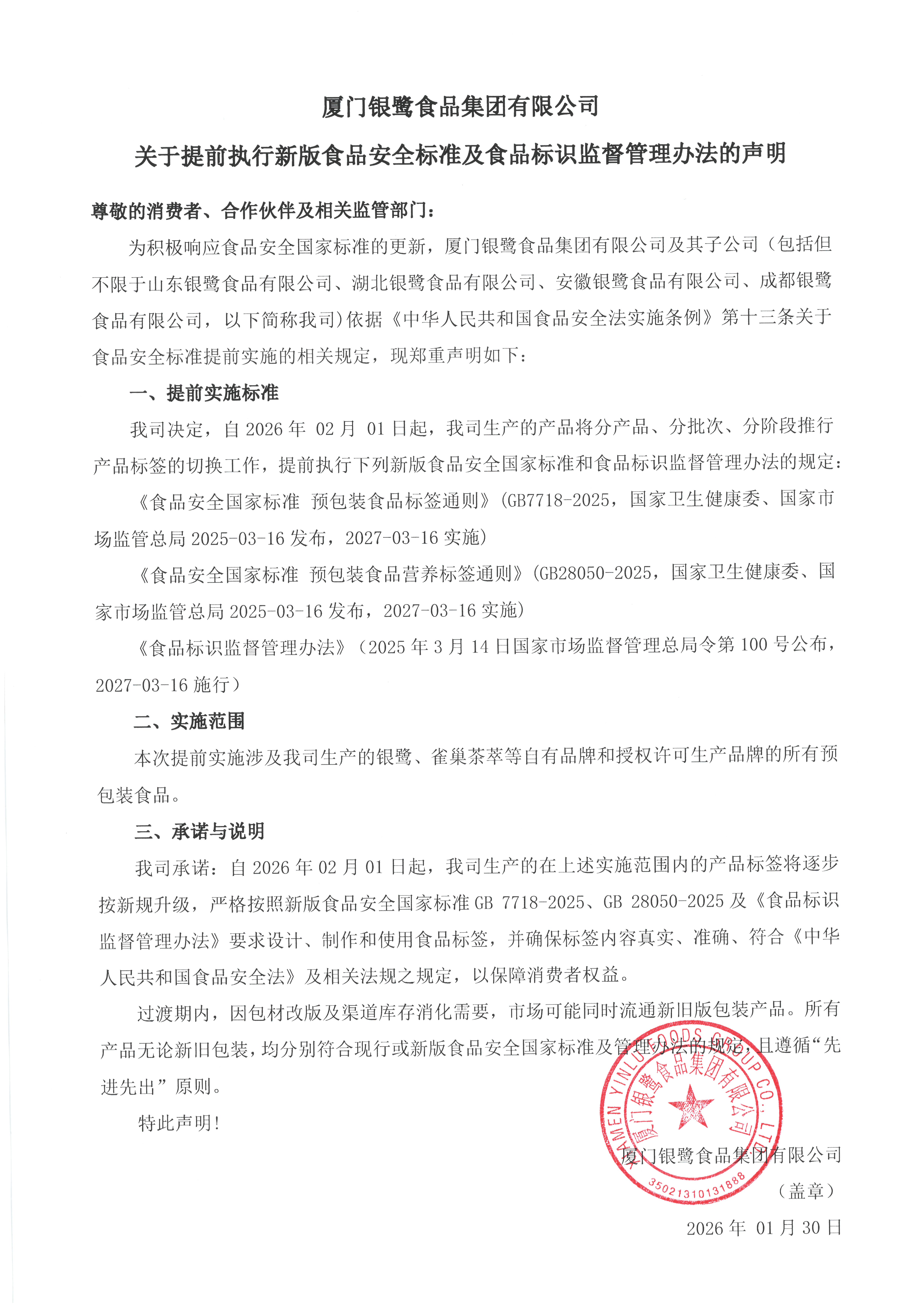 廈門銀鷺食品集團有限公司 關于提前執行新版食品安全標準及食品標識監督管理辦法的聲明